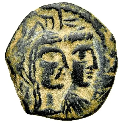 | Beschrijving keerzijde | Double cornucopias, the names of the King & Queen in Nabataean Aramaic between them. |