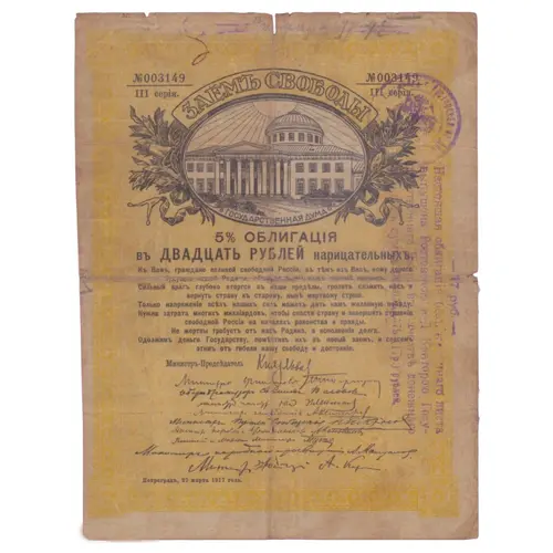 Black on yellow underprint. At the top center, oval frame depicts the Tauride Palace (seat of the State Duma), flanked by laurel branches. Directly beneath the vignette, bold text, with several paragraphs of smaller text filling the central area below, followed by a cluster of signatures. The serial number is printed twice—once at the upper left and again at the upper right. Framed by intricate guilloche frame with square corner ornaments. At least two stamps; round ОГБ (Отделения Государственного Банка/Office of the State Bank) and rectangular one. |