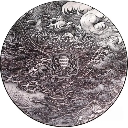 A traditional Chinese representation of a storm over the sea and mountains. The stormy sea is shown with powerful, crashing waves and dark, swirling clouds overhead. In the center, the Coat of Arms of Chad with the inscriptions: `REPUBLIQUE DU TCHAD` – the issuing country, `18888 FRANCS CFA` – the face value and `2024` – the year of issue. |