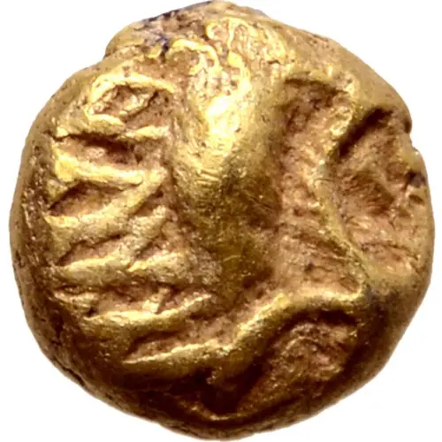 | Beschrijving voorzijde | Head of lion with open jaws and globule on forehead, right. |