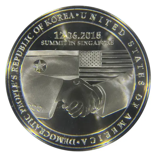 The reverse of the medallion features a dove. A universal symbol of peace, the dove highlights the significance of the summit which is a historic step towards world peace. The national flowers of the United States and North Korea, Rose and Magnolia sieboldii, are respectively featured on the medallion, interlaced with each other and in vibrant colours. |