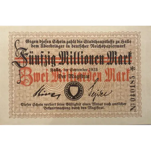 Gegen diesen Schein zahlt die Stadthauptkasse zu Halle dem Überbringer in Deutscher Reichspapiermark Fünfzig Millionen Mark Halle,im September 1923 Der Magistrat Dieser Schein verliert feine Gültigkeit einen Monat nach amtlicher Bekanntmachung durch den Magistrat ZWEI MILLIARDEN MARK |