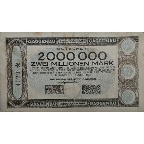 | Ön yüz lejandı | Gutschein 2 000 000 Zwei Millionen Mark Dieser Schein wird von den Kassen der Stadt Gaggenau zum vollen Nennwert in Zahlung genommen und nach Aufruf in den Bezirksblättern sowie in der `Karlsruher Zeitung` eingelöst. - August 1923 |