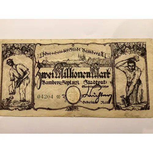 Obverse lettering Gutschein der Stadt Bamberg Zwei Millionen Mark Bamberg,Sep.1923 Oberbürgermeister Geheims Rat.