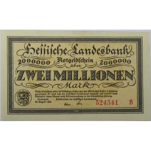 Hessische Landesbank 2 000 000 Notgeldschein 2 000 000 über ZWEI MILLIONEN Mark Dieser Geldschein wird im Volksstaat hessen von den öffentlichen kassen in Zahlung genommen. Er wird von der Hessischen Landesbank eingelöst und verliert seine Gültigkeit einem Monat nach Bekanntmachung in der Darmstädter Zeitung. Darmstadt, 22. August 1923 Direktorium der Hessischen Landesbank. (Translation: Hessen State Bank Emergency Currency Note for Two Million Marks This note shall be accepted as payment at public banks within the People`s State of Hessen. It will be redeemed by the Hessen State Bank and will lose its validity one month after notice in the Darmstadt newspaper. Darmstadt, the 22nd of August 1923 Directorate of the Hessen State Bank.) |