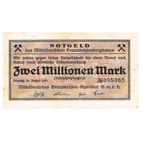 | Obverse lettering | NOTGELD des Mitteldeutschen Braunkohlenbergbaues Wir zahlen gegen diesen Notgeldschein bis einen Monat nach Aufruf durch öffentliche Bekanntmachung Zwei Millionen Mark (Reichspapiergeld) Leipzig, im August 1923 Mitteldeutsches Braunkohlen-Syndikat G.m.b.H. |