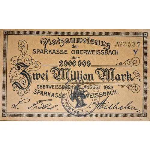Obverse lettering Platzanweisung der SPARKASSE OBERWEISSBACH über 2000 000 Zwei Million Mark OBERWEISSBACH, 20 AUGUST 1923 SPARKASSE OBERWEISSBACH.