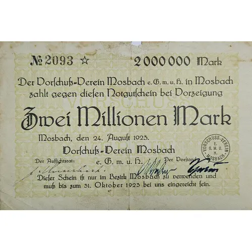 | Opis líce | 2 000 000 Mark Der Vorschuß-Verein e. G. m. h. In Mosbach zahlt gegen diesen Notgutschein bei Vorzeigung Zwei Millionen Mark Mosbach, den 24. August 1923 Vorschuß-Verein Mosbach Dieser Schein ist nur im Bezirk Mosbach zu verwenden und muß bis zum 31. Oktober 1923 bei uns eingereicht sein. |