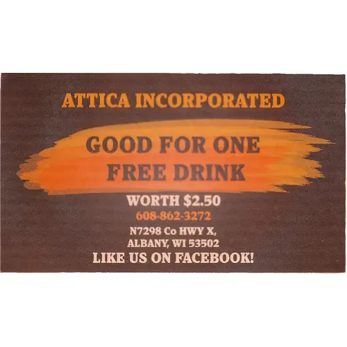| Obverse lettering | ATTICA INCORPORATED GOOD FOR ONE FREE DRINK WORTH $2.50 608-862-3272 N7298 Co HWY X, ALBANY, WI 53502 LIKE US ON FACEBOOK! |