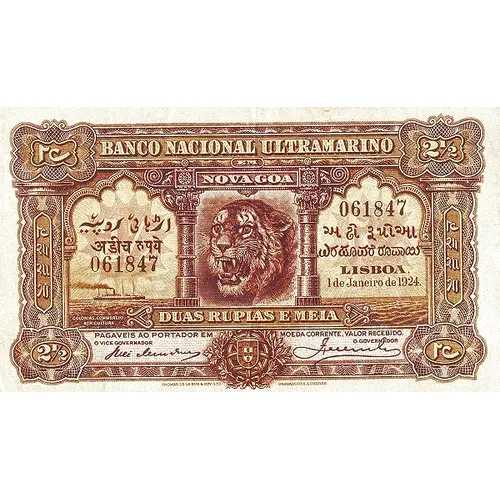 | Obverse lettering | BANCO NACIONAL ULTRAMARINO NOVA GOA DUAS RUPIAS E MEIA LISBOA, 1deJANEIROde1924 |