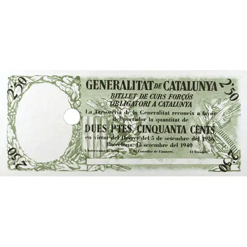 | Obverse lettering | 2`50 GENERALITAT DE CATALUNYA BITLLET DE CURS FORÇÓS OBLIGATORI A CATALUNYA La Tresoreria de la Generalitat reconeix a favor del portador la quantitat de DUES PTES. CINQUANTA CÈNTS. en virtut del Decret del 5 de setembre del 1936. Barcelona, 13 setembre 1940 (Translation: Generalitat de Catalunya Mandatory course banknote in Catalonia The Treasury of the Generalitat recognizes in favor of the bearer the amount of Two Pesetas Fifty Centimos by virtue of the Decree of September 5, 1936 Barcelona, September 13, 1940) |