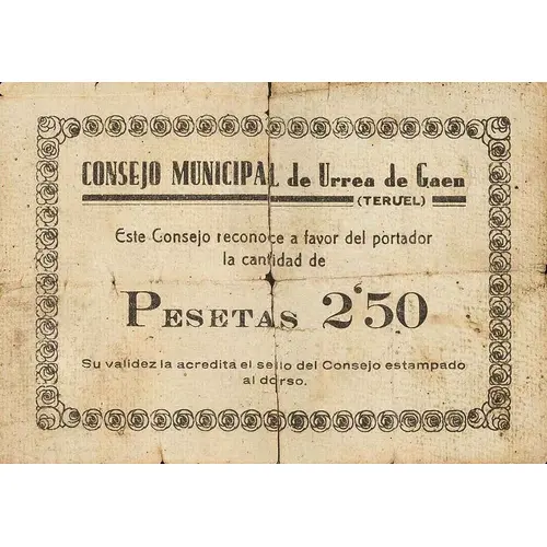 CONSEJO MUNICIPAL de Urrea de Gaen (TERUEL) Este Consejo reconoce a favor del portador la cantidad de PESETAS 2`50 Su validez la acredita el sello del Consejo estampado al dorso (Translation: Municipal Council of Urrea de Gaén (Teruel) This Council recognizes in favor of the bearer the amount of Pesetas 2.50 Its validity is confirmed by the seal of the Council, stamped on the back) |