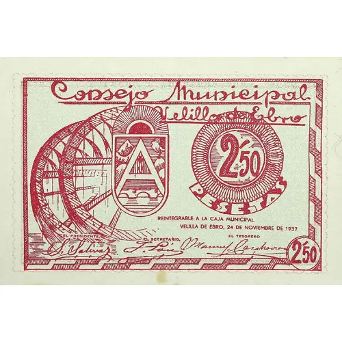 Consejo Municipal Velilla de Ebro 2`50 PESETAS REINTEGRABLE A LA CAJA MUNICIPAL VELILLA DE EBRO, 24 DE NOVIEMBRE DE 1937 (Translation: Municipal Council of Velilla de Ebro 2.50 Pesetas Reintegrable to the Municipal Fund Velilla de Ebro, November 24, 1937) |