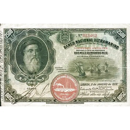 BANCO NACIONAL ULTRAMARINO O THESOUREIRO DA AGENCIA EM LOURENÇO MARQUES PAGARÁ Á VISTA AO PORTADOR DOIS MIL E QUINHENTOS REIS EM MOEDA CORRENTE VALOR RECEBIDO |