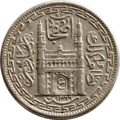 | Obverse description | CharMinar (FourMinarets) gateway Legend in Urdu :92 Asaf Jah (top), bahadur (left) Nizam Al-Mulk (right). `Ain` (Urdu alphabet for `O`, initial of `Osman` in the doorway). AH date below gateway |