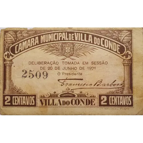 CAMARA MUNICIPAL DE VILLA DO CONDE DELIBERAÇÃO TOMADA EM SESSÃO DE 20 DE JUNHO DE 1921 O Presidente 2 CENTAVOS VILLA DO CONDE 2 CENTAVOS LIT. NACIONAL - PORTO (Translation: Villa do Conde city council Deliberation taken in session of June 20, 1921 the president 2 centavos Lit. national - Porto) |