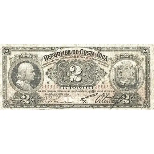 Obverse lettering REPÚBLICA DE COSTA-RICA CERTIFICAMOS QUE ESTÁ DEPOSITADO EN PLATA EN LA ADMINISTRACIÓN DE RENTAS PUBLICAS EL VALOR DE 2 DOS COLONES QUE SERÁ PAGADO AL PORTADOR Á LA PRESENTACIÓN, EN MONEDAS DE 25 Ó 50 CENTIMOS. San José de Costa Rica 1ᵒ de Julio de 190 6 EL SECRETARIO DE HACIENDA. EL ADMINISTRATOR PRINCIPAL. 2 DOS American Bank Note Co. New York