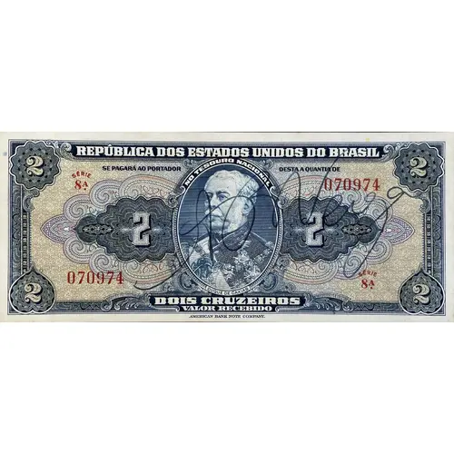| Obverse lettering | 2 2 REPÚBLICA DOS ESTADOS ESTADOS UNIDOS DO BRASIL SE PAGARÁ AO PORTADOR DESTA A QUANTIA DE DOIS CRUZEIROS NO TESOURO NACIONAL 2 2 DUQUE DE CAXIAS VALOR RECEBIDO 2 2 AMERICAN BANK NOTE COMPANY. (Translation: Republic of United States of Brazil will be paid to the carrier of this amount of Two Cruzeiros in the National Treasury Duque de Caxias Amount Received American Bank Note Company.) |