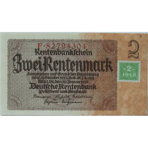 Lettering (regular font): Rentenbankschein 1 Zwei Rentenmark - 2 - 1948 Ausgegeben auf Grund der Verordnung vom 15.October 1923 BERLIN, den 30. Januar 1937. Deutsche Rentenbank Präsident und Vorstand: |