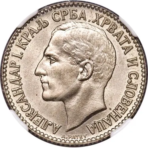 Legenda awersu АЛЕКСАНДАР I. КРАЉ СРБА, ХРВАТА И СЛОВЕНАЦА A.PATEY