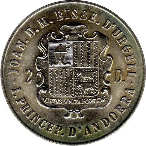 | Obverse lettering | JOAN. D. M. BISBE. D`URGELL I. PRINCEP. D`ANDORRA VIRTVS VNITA FORTIOR 2 D. (Translation: Joan D.M. Bishop of Urgell and Prince of Andorra United virtue is stronger) |