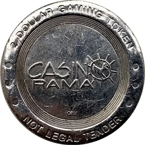 | Leyenda del anverso | 2 DOLLAR GAMING TOKEN CASINO RAMA CPM NOT LEGAL TENDER |