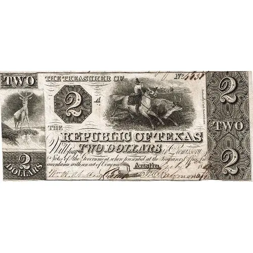 | Legenda del dritto | THE TREASURER OF THE REPUBLIC OF TEXAS Will pay TWO DOLLARS in Promissary Notes of the Government when presented at the Treasurers Office. In accordance with an act of Congress. Austin ____ 18__ TWO 2 2 TWO DOLLARS |