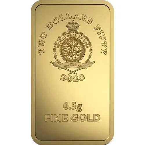 | Obverse lettering | TWO DOLLARS FIFTY PUBLIC SEAL OF NIUE ATUA NIUE TUKULAGI 2023 0.5g FINE GOLD |