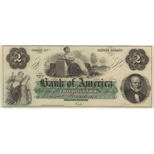 | Obverse lettering | STATE OF RHODE ISLAND The BANK OF AMERICA will pay TWO DOLLARS to bearer on demand Providence 18___ National Bank Note Company New York |