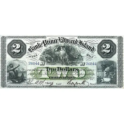 THE PRESIDENT DIRECTORS AND CO OF THE Bank of Prince Edward Island WILL PAY on demand Two Dollars to bearer out of the Joint-Funds of the Corporation Canada Bank Printing Tint CHARLOTTE TOWN 1st Jan 1877 Cashr Prest British American BANK NOTE Co. Montreal & Ottawa 2 2 CANADA CURRENCY |