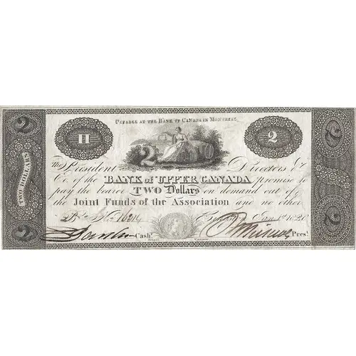 | Obverse lettering | PAYABLE AT THE BANK OF CANADA IN MONTREAL II 2 The President Directors & Co. of the BANK of UPPER CANADA promise to pay the bearer TWO Dollars on demand out of the Joint Funds of the Association and no other No Kingston Jan 1st 1820 Cashr. Prest. Graplne Company 2 2 TWO DOLLARS 2 2 |