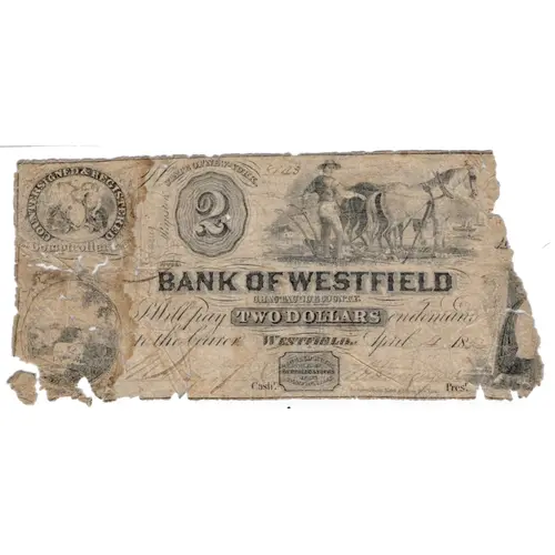 | Obverse lettering | Countersigned & Registered STATE OF NEW YORK Comptroller 2 A 2 BANK OF WESTFIELD CHAUTAUQUE COUNTY Will Pay TWO DOLLARS On Demand to the bearer WESTFIELD April 4 1852 SECURED BY THE PLEDGE OF PUBLIC STOCK OF THE STATE OF N YORK CASH!______ PRES!______ Rawdon, Wright, Hatch & Elson New York. |