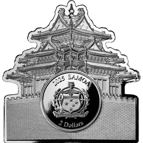 | Obverse description | Coat of arms with date above and denomination below, one of the Beijing Imperial Palace watchtowers in the background. |