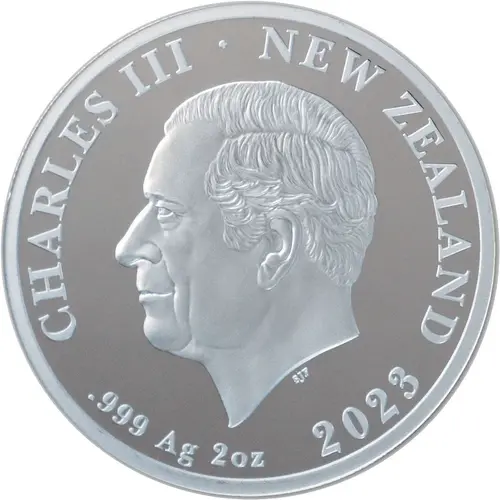 | Obverse lettering | CHARLES III NEW ZEALAND SJF .999 Ag 2oz 2023 |