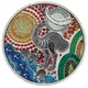 Emu with cultural markings and three young chicks in the centre. In the background are the sun, a floating feather, mountains, and flowing river with a trail of footprints. |