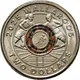 A female Rugby player running with the ball, an opponent about to tackle above the centre circle which is randomly coloured orange & green which contains a Wallaby, Rugby goal posts below. |