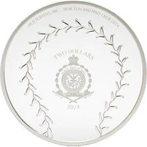 Надписи аверса MLB PLAYERS INC. NEW ZEALAND MINT / MLB 2024 TWO DOLLARS PUBLIC SEAL OF NIUE ATUA NIUE TUKULAGI 2024