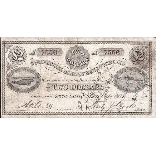 | Obverse lettering | 2$ 2$ TWO DOLLARS COMMERCIAL BANK OF NEWFOUNDLAND TWO DOLLARS We promise to pay the Bearer on Demand TWO DOLLARS Currency in SPECIE. SAINT JOHNS. 1st July / 1884 |