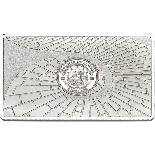 Rounded central area with the coat of arms of Liberia, spiral paving pieces around it. |