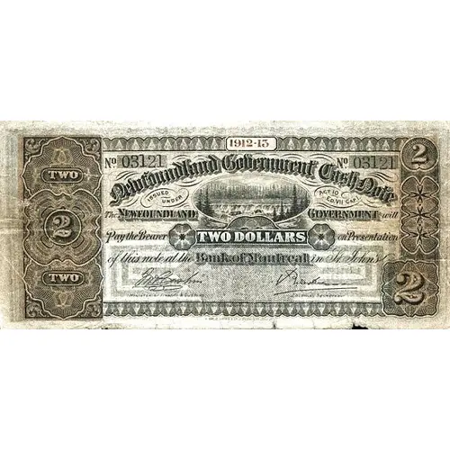 1912-14 TWO TWO Newfoundland Government Cash Note ISSUED UNDER - ACT 10 ED. VII CAP 1 The NEWFOUNDLAND - GOVERNMENT will Pay the Bearer TWO DOLLARS on Presentation of this note at the Bank of Montreal in St. John`s MINISTER OF FINANCE & Customs - COLONIAL SECRETARY TWO 2 |