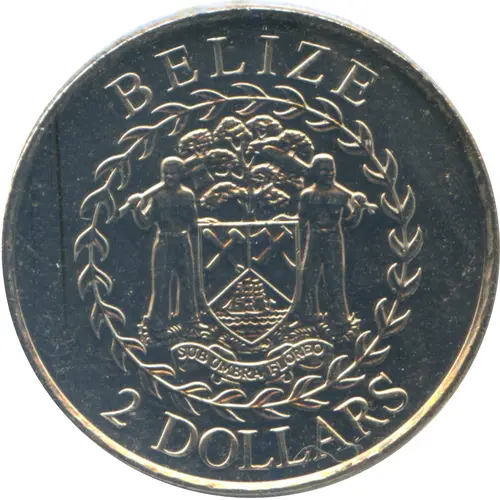 Artistry: The design, characteristic of contemporary Commonwealth coinage, typically features a widely recognized effigy of Queen Elizabeth II on the obverse, such as the Ian Rank-Broadley portrait. The reverse of KM#139 specifically showcases the national Coat of Arms, a powerful emblem of Belizean identity. This complex design, likely by an uncredited engraver in a realist style, incorporates the mahogany tree, two woodcutters, and the national motto "SUB UMBRA FLOREO" (Under the Shade I Flourish), symbolizing the nation's heritage and resilience.