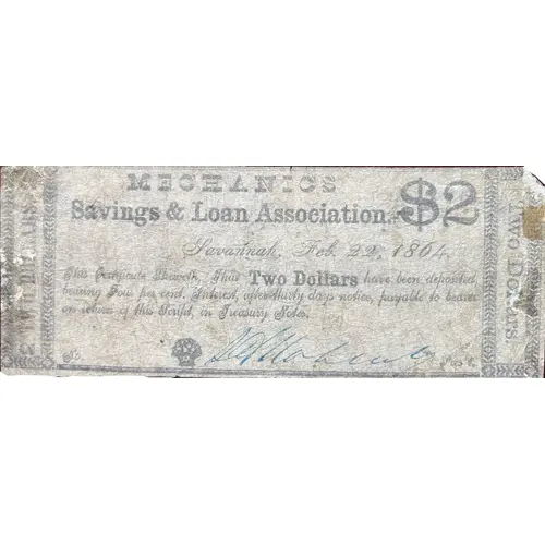 | Obverse lettering | MECHANICS Savings & Loan Association. $2 Savannah, Feb. 22, 1864 This Certificate Showeth, That Two Dollars have been deposited bearing Four per cent. Interest, after thirty days notice, payable to bearer on return of this Script, in Treasury Notes. No. Pres`t. 2 TWO DOLLARS. 2 on the left side Two Dollars. on the right side |