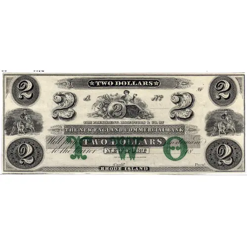 2 TWO DOLLARS 2 2 2 THE PRESIDENT, DIRECTORS & CO., OF THE NEW ENGLAND COMMERCIAL BANK Will pay TWO DOLLARS on demand TWO to the bearer NEWPORT____________18___ NEW ENGLAND BANK NOTE CO., BOSTON. 2 _____________ Cash.ʳ______________Pres.ᵗ 2 RHODE ISLAND |