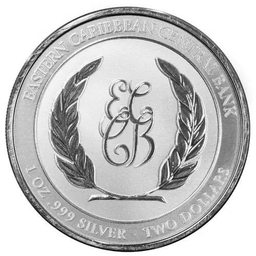 Obverse lettering EASTERN CARIBBEAN CENTRAL BANK EC CB 1 OZ .999 FINE SILVER · TWO DOLLARS