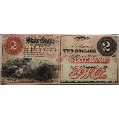| Obverse lettering | THE State Bank OF MICHIGAN, LYMAN`S PROTECTION. Bank note on the right end measuring: $1. One Dollar, One third the length of the paper $2. Two Dollars, One half ` ` ` $3. Three Dollars, Two thirds ` ` ` $5. Five Dollars, Three fourths ` ` ` AMERICAN BANK NOTE COMPANY DETROIT, __ 18_ On demand TWO DOLLARS Will be paid to bearer by the STATE BANK OF MICHIGAN. A / NO. SECURED BY PLEDGE OF PUBLIC STOCKS |