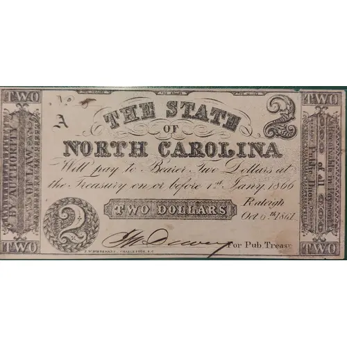 | Opschrift voorzijde | TWO DOLLARS TWO DOLLARS TWO DOLLARS No____ A THE STATE OF NORTH CAROLINA (in cursive) Will pay to Bearer Two Dollars at the Treasury on or before 1st Jany. 1866 Raleigh Oct. 6th 1861 TWO DOLLARS _____________ For Pub. Treasr. F. W. BORNEMANN, CHARLESTON, S.C. (Left flank) TWO BY AUTHORITY OF LAW TWO (Right flank) TWO Receivable in Payment of all Public Dues. TWO |