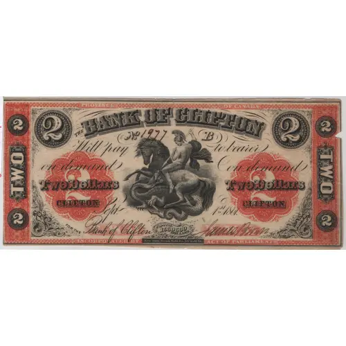 PROVINCE OF CANADA 2 THE BANK OF CLIFTON 2 Will pay to bearer on demand on demand Two Dollars Two Dollars CLIFTON CLIFTON Sept. 1st 1861. FOR THE Bank of Clifton CAPITAL 1000000 DOLLARS INCORPORATED BY New York Bank Note Co. 50 wall St. ACT OF PARLIAMENT 2 2 TWO TWO 2 2 |