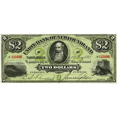 $2 UNION BANK OF NEWFOUNDLAND $2 SAINT JOHNS 1st May 1882 We promise to pay the bearer on demand TWO DOLLARS CURRENCY IN SPECIE ACCOUNTANT MANAGER American bank Note Co. New York |