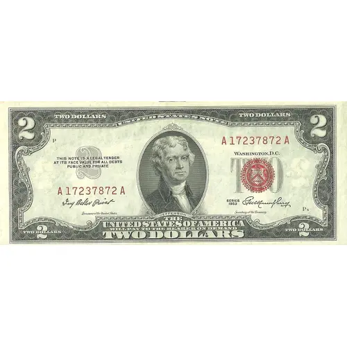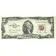 Black and white print; red serial numbers and seal. Portrait of Thomas Jefferson at center. Treasurer`s signature and 2 at left. Secretary`s signature and Treasury Seal at right. |