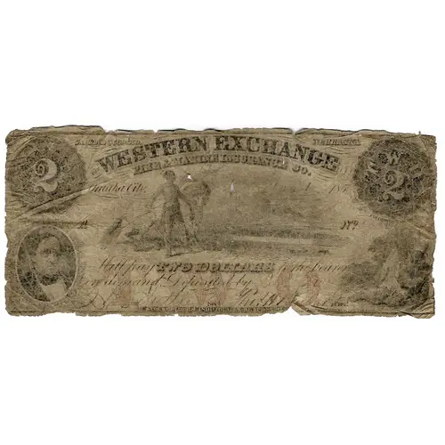 | Obverse lettering | 2 CAPITAL $500,000 NEBRASKA 2 THE WESTERN EXCHANGE FIRE &MSRINE INSURANCE CO. Omaha City. INCORPORATED 1855 A No Will pay TWO DOLLARS to the bearer on demand, Deposited by_____ Sec. Pres! STOCKHOLDERS INDIVIDUALLY RESPONSIBLE |